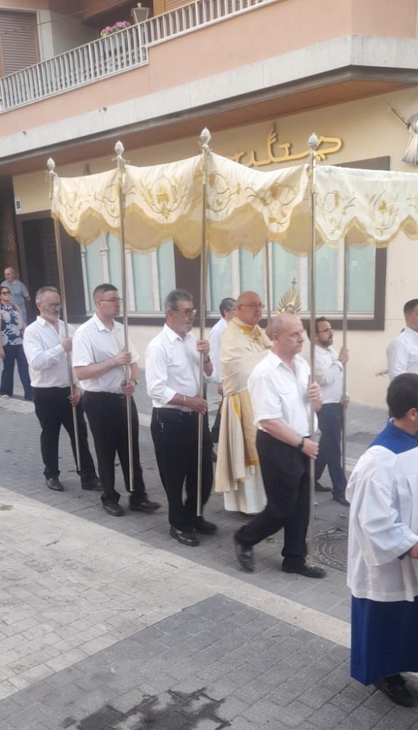 Nuevamente este año, la Junta de cofradía ha participado en la festividad del Corpus Christi. Tanto decorando la subida a la iglesia de Santa María, como ayudando con unos pocos cofrades a llevar el Palio.